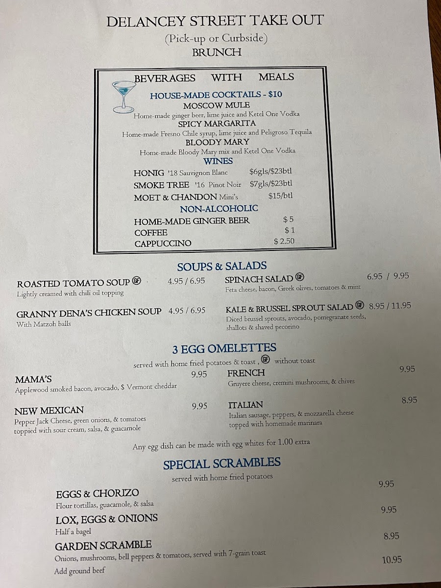 The menu at Delancey Street Restaurant offers a thoughtful selection of American classics with a comfortable, unpretentious feel that suits everything from a relaxed brunch to a casual dinner out. It’s a place where familiar favorites like the Crabcake Benedict or Bourbon Glazed Rib Eye Steak share space with homestyle comforts such as Granny Dena’s Chicken Matzoh Ball Soup and French Toast, making it easy to savor a meal no matter the time of day.